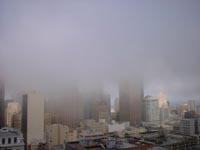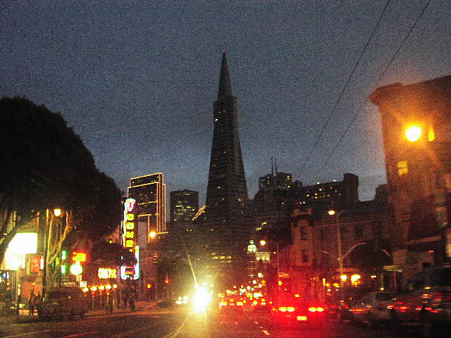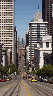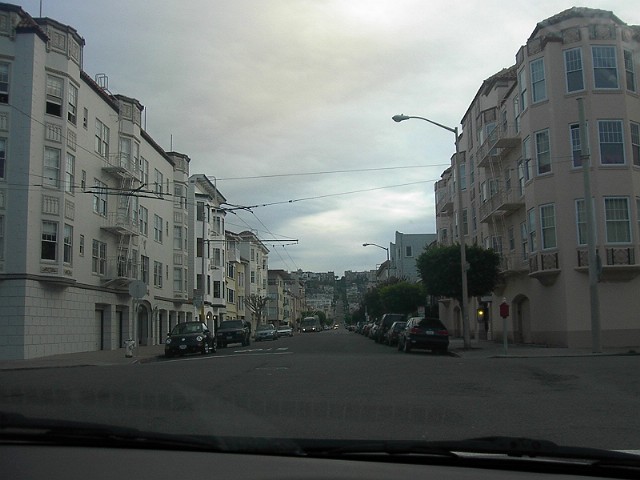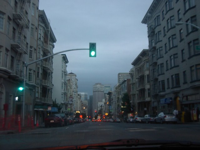 丘を降りるケーブルカーです。暗くて写真しくじりました。丘と坂道、ケーブルカー、霧この3つがサンフランシスコの基本的景色を作ってるように感じます。 |