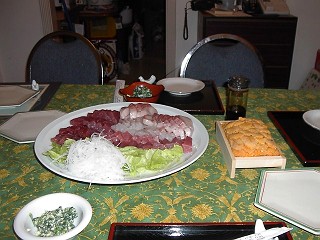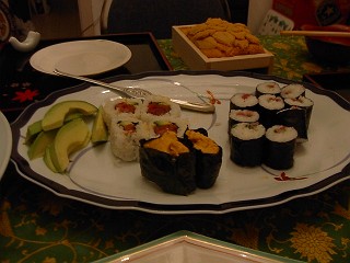 夜は大量のお寿司、お刺身いただきました。これ(新鮮な魚介類)はIowaではあり得ないものので、本当に涙ものでした。日本人の性です。 |
