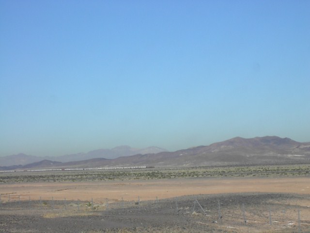 この辺は砂漠といっていい感じです。遥か彼方に汽車が走っています。実に広大です。 |