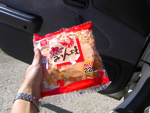 眠気覚ましには食欲で対抗します。この日、日本から持って帰ってきていたえびみりん焼き、エビセンですね。