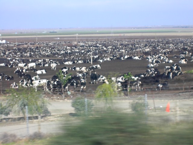 牛もまとめ飼いです、このとおり。これだけのまとめ飼いしてるんです。BSEとか日本が言っても気にしない訳ですよ。全てをチェックするなんてできっこないんです。 |