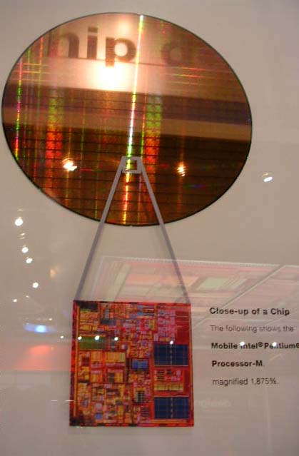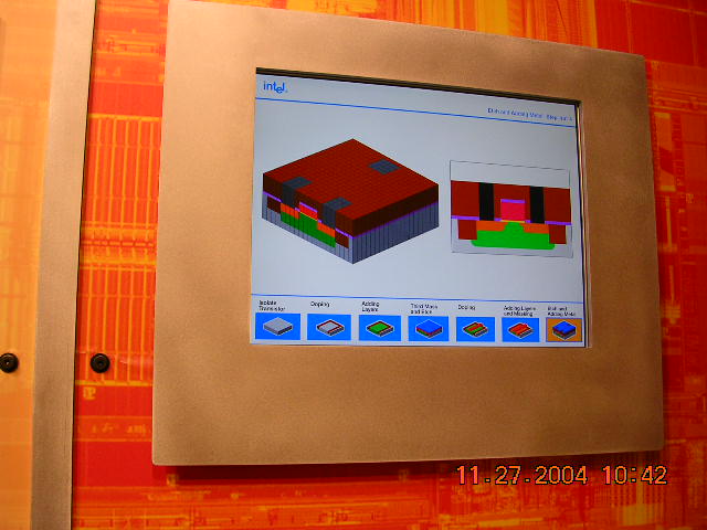 なんと、今、主流のPentium Mの作り方の基本を紹介していました。こりゃ、すごいよ。シリコンの層が丁度20個積み重なってるんだそうな... 超精密な世界に驚嘆しました。 |