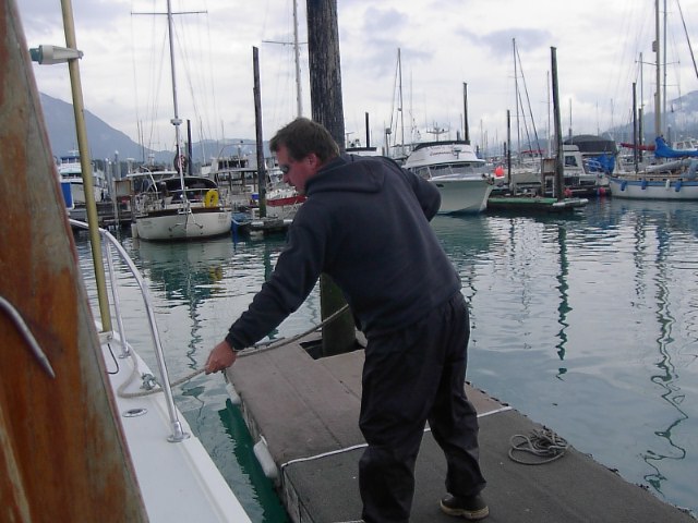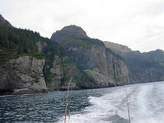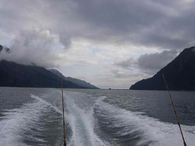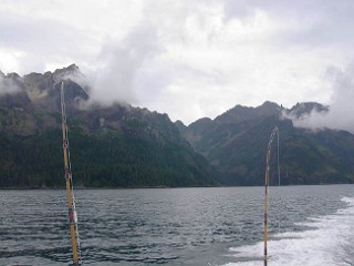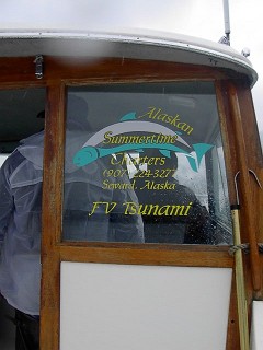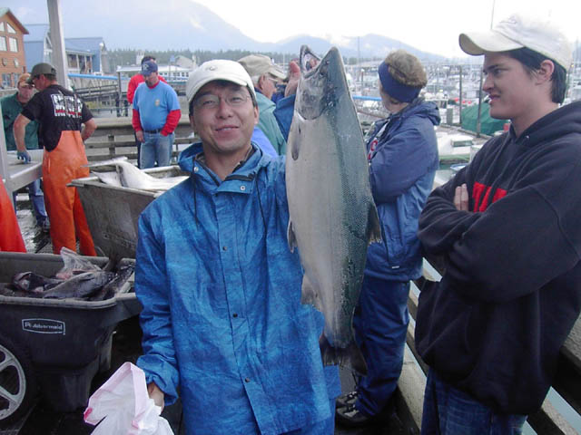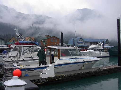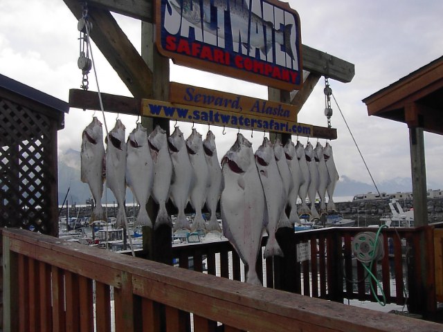 と釣り下がったこの魚。ハリバットという魚です。いわゆるヒラメの系統なのでしょう。凡人は雨が降っているので、釣りなら雨の方が好条件だと思って、ワザワザ、デナリから移動してきたのです。日本人の自分のアラスカでの釣り、という場合のイメージはサーモン釣りです。Sewardはアラスカでも最大の釣りのメッカとして知られています。ですから、ここSewardでサーモンを釣ろうと思ってきたのです。しかし、ここは川釣りでなく海釣りのメッカでした。ことにターゲットはこのハリバットで白身の大変おいしい魚なのだそうです。ハリバット釣りは朝5時から出発して100マイル以上沖合いにでて狙う大物の海の魚です。沖合いにはコディアック島、という島がありますがそこは世界の太公望の憧れの場所だということが分かりました。 |