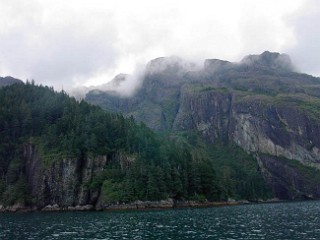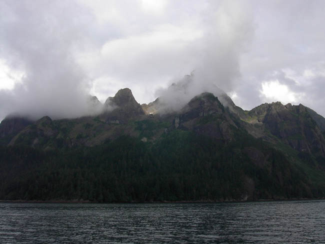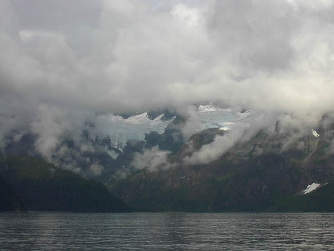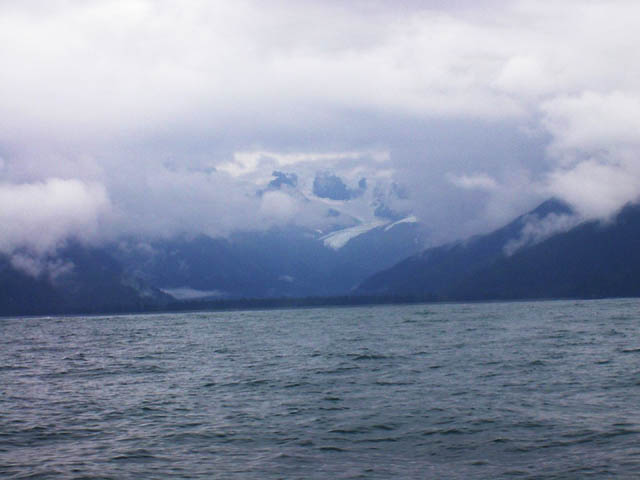 海は荒れていて船はそこをスッ飛んで行くような感じでした。岸から天に急峻にそびえ立つ山に雨雲が低く垂れ込めていて、その隙間から氷河が時折、顔をのぞかせていました。 |