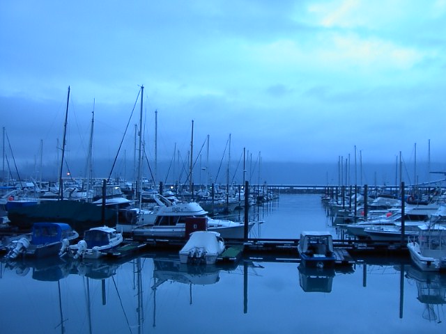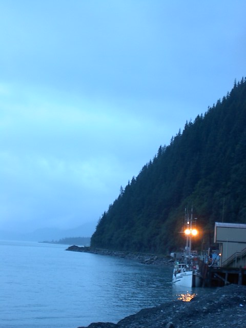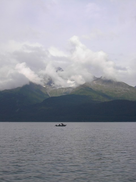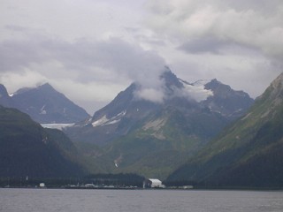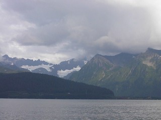 アンカレジから南に4時間、海の向こうにはキナイ半島を作っている、キナイ・ペニンシュラの山々があり、そこには低く低く雲が垂れ込めていました。その山、雲の下にSewardの町はひっそりとたたずんでいます。 |