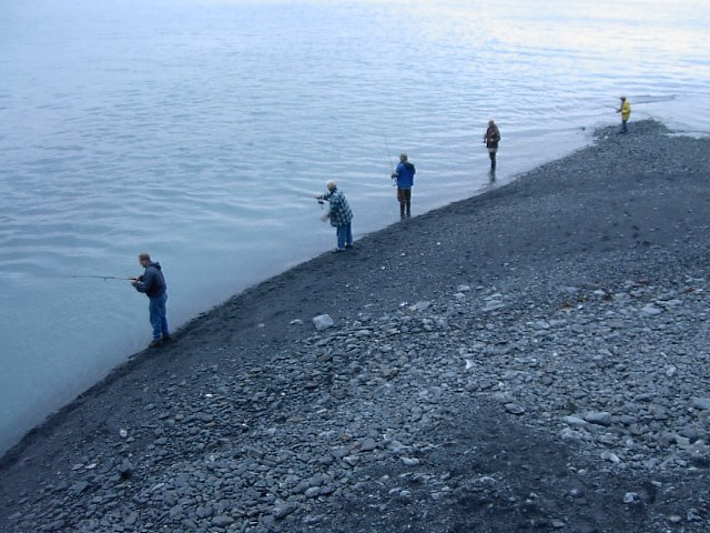 その滝のすぐ下流で、沢山の釣り人が夕暮れ時、大物を一発狙っていました。この町、Sewardはその沖合いで暖流、寒流が混ざり合い、大変素晴らしい海釣りのメッカとなっています。