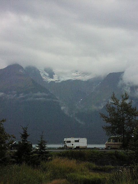 氷河はこの辺りには本当に何処にでもあります。そして、ここではモーテルなんかに泊まるよりもテント、キャンピングカーがメジャーだということが分かりました。だって、場所がいい。この町の何処にいても素晴らしいんです。キャンプサイトの目の前には海が広がっています、小さな湾になっていて、その湾をこれでもかというくらいに多くの急峻な山がぐるりと取り巻いているのです。印象としては山脈に囲まれた盆地に海があるというくらいに思えるくらい特異な印象を持つ場所です。そして、極めつけはその山々が氷河を抱いている...