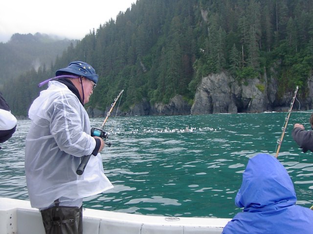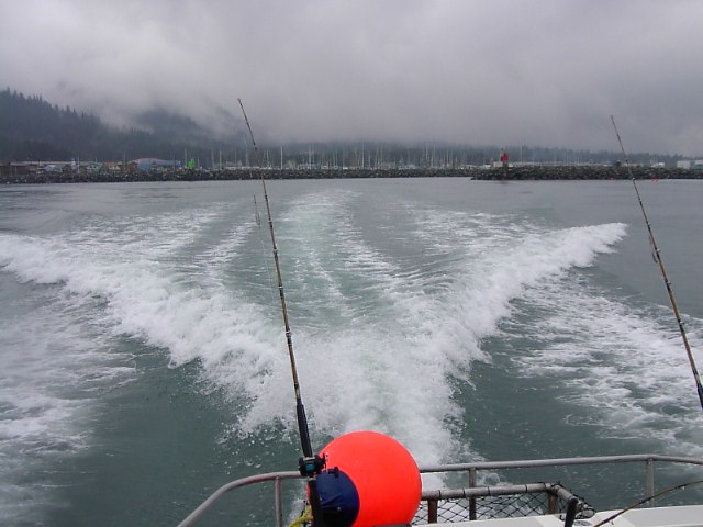 雨でチーンとしている氷河観光豪華客船を尻目に沖合いのサーモン・ポイントを目指しました。 |