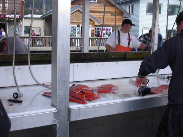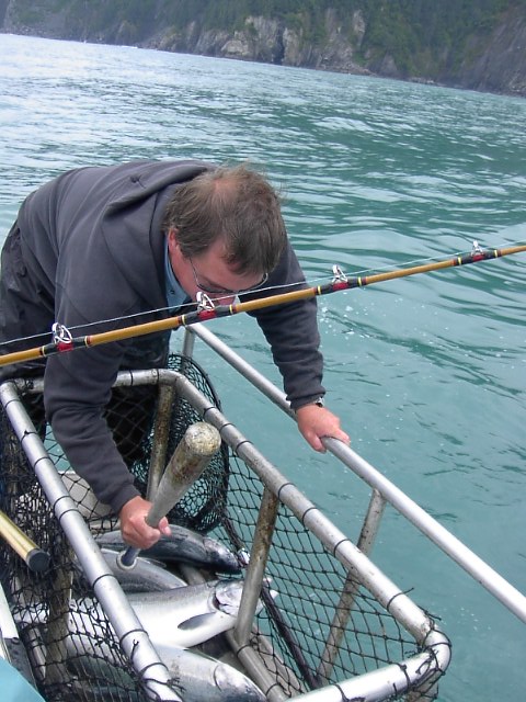 籠で暴れまわるサーモンをバットでひと叩きに気絶させたり、と大忙しでした。 |