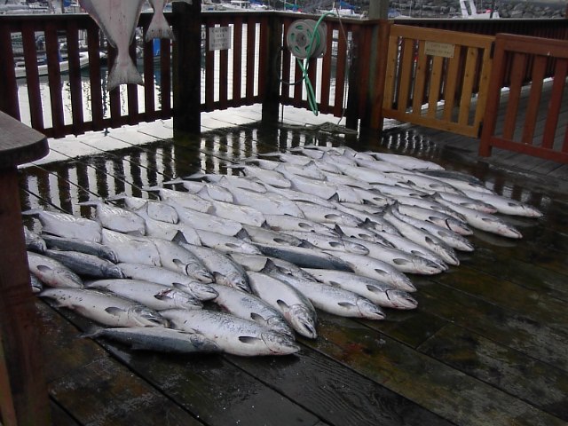 港に帰ってくると、他の沢山の釣り客も帰ってきていました。朝から沖合い100マイルのポイントまで出かけていた人達の釣績は凄いものがありました。大きなサーモンとその数もですが |