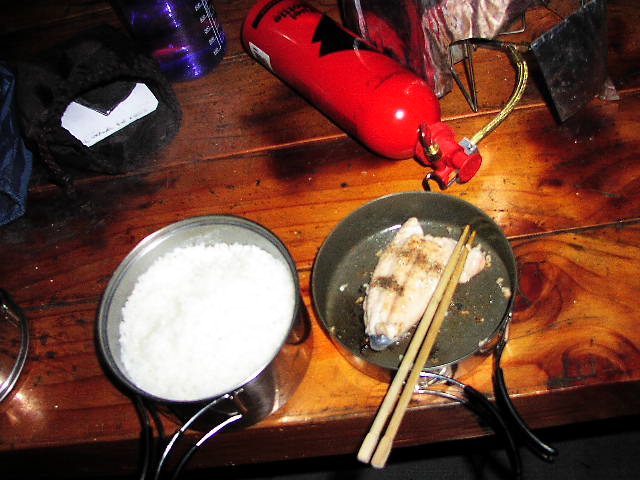 と、その日の夜にはキャンプサイトでサーモンを焼いてご馳走を楽しみました。(そして、このサーモンパワーは翌日のHarding Ice Field行きのパワーの根源になりました。)ちなみにこの日のキャンプサイトではアイルランドから来ていたBackpackerの女の子達、それからロシアから来ていたBackpackerのペアの子達とサーモンParty、楽しい時間でした。デナリでの数々の単独行の話をコッチがすれば、アイルランドの子達はWrangell