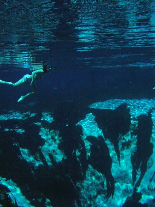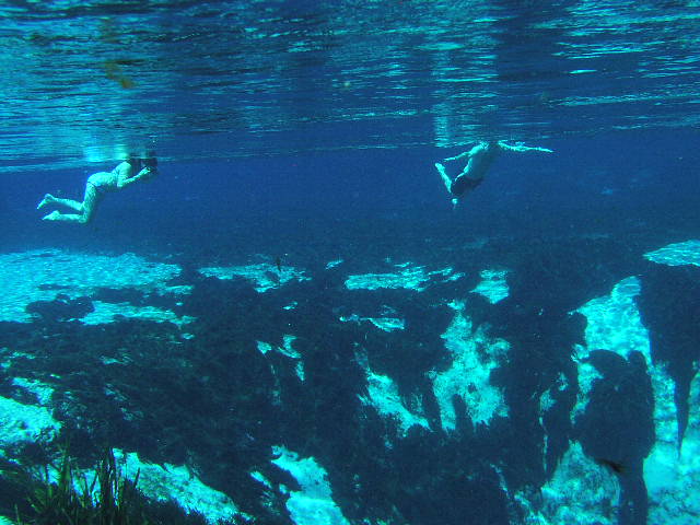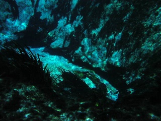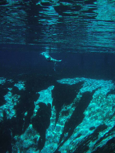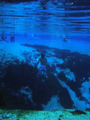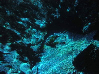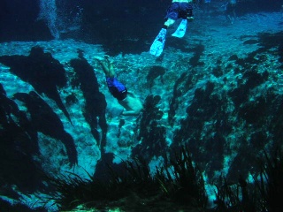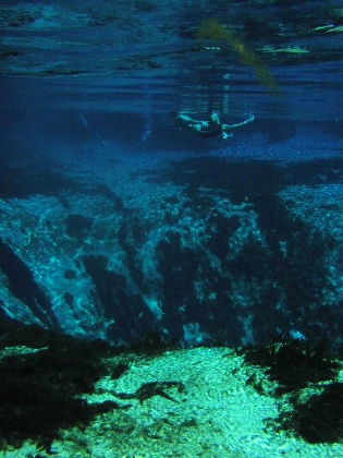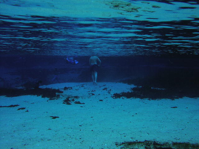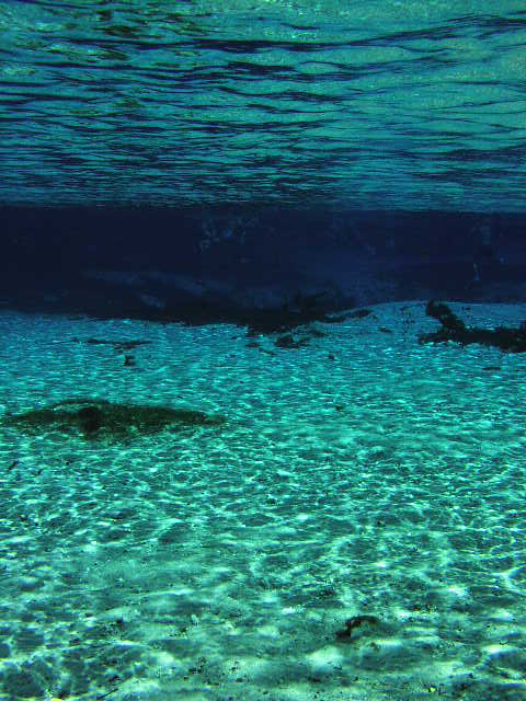 奥のほうに泳いでいくと蒼暗い場所が広がっています。泉の深み、Spring Headがこの先にあるんでしょう。 |