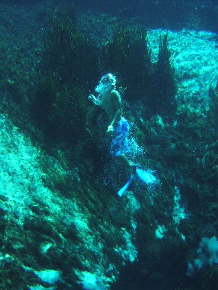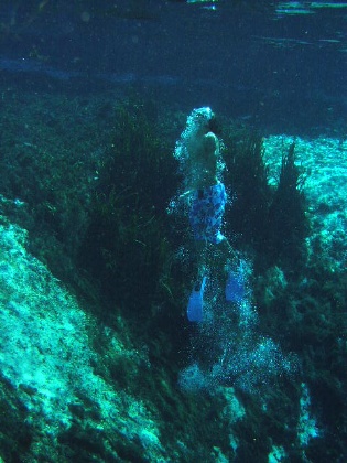 ここはこの深みの場所、最深部にいくつかの小さな穴があってそれぞれから凄い水量の水が湧き出しています。これらのSpring Headまで深さ10mくらいのもんじゃないかと思います。でも、ここっていうのは(水草の覆う場所も写真のようにありますが)砂が周囲を囲んでいるわけですから、これが一旦崩れ落ちSpring