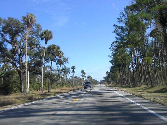写真はそのフロリダの道路の一風景です。基本はこのように松やら椰子の木やらです。中西部とはかなりドライブも違った雰囲気です。 |