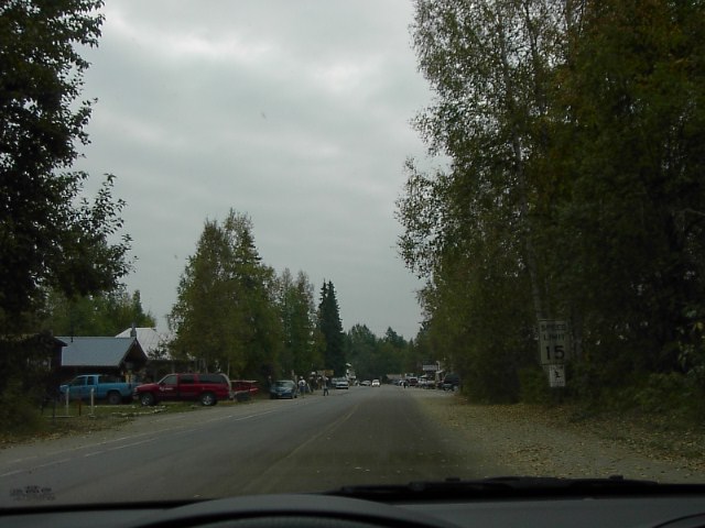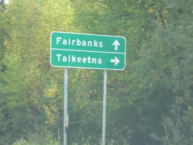 そして2時間程進むとようやく目的地を示す看板が現れました。目的地はフェアバンクス、じゃなかったタルキートナという場所です。アラスカでアンカレジの北に位置しています。 |