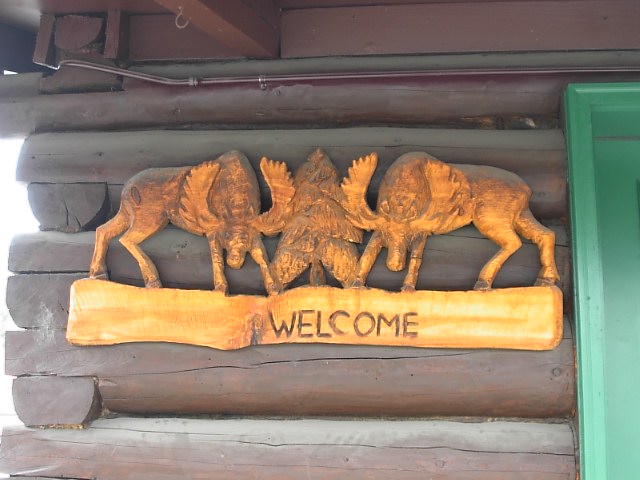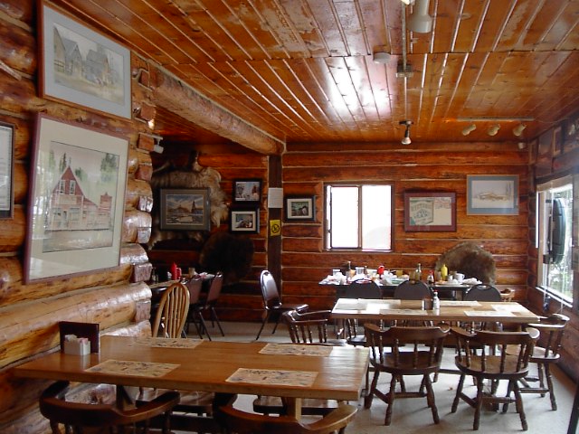 このモーテルはレストランも併設していて、この通りログハウス仕立てでなかなかいい雰囲気です。この写真奥の焦げ茶色の柱の脇に額に入った3枚の写真があるのがわかるでしょうか?ちょっとアップしてみましょうか。 |