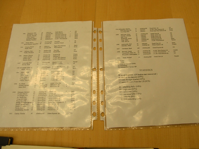 お墓はありませんでしたが、マッキンリー登山者の死亡者リストがありました。殆ど毎年、数人の登山者が亡くなっている事実にちょっと驚きました。それだけ、マッキンリーは厳しい山なのですね。当たり前でしょうが... |