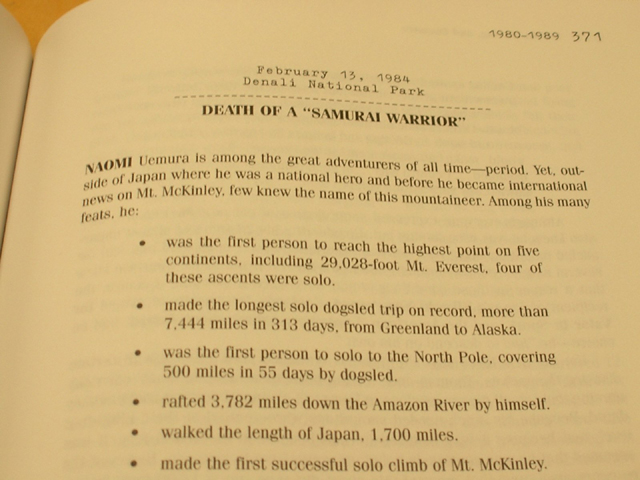 まず、植村直巳さんがマッキンリーでお亡くなりになったと言う事実を告げると、おもむろに、このステーションで管理している