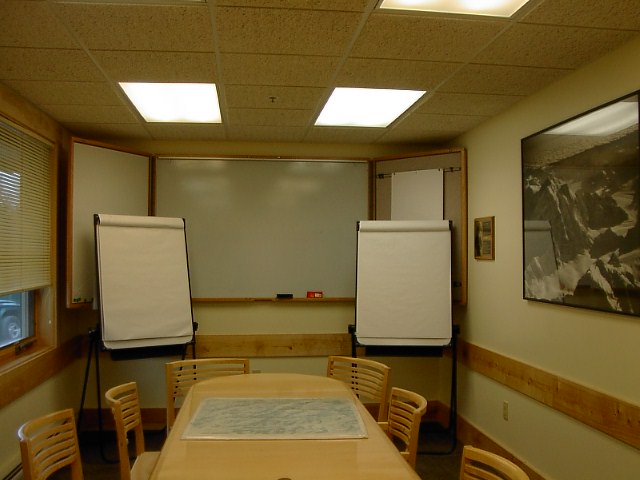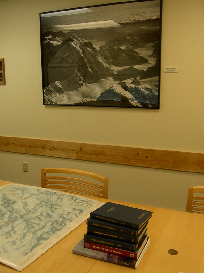 そうして奥の図書室兼会議室に凡人を案内してくださいました。写真はその部屋です。部屋にはマッキンリー登山をするのに必要な全ての情報が凝縮されていました。右手にはマッキンリー南壁(こっちが難しい)、北壁の写真。左手手前には山に関わる各種蔵書。そして正面には写真のように作戦を練るためのホワイトボード、長いテーブルとそれをとり囲む椅子があってテーブルの真ん中にはマッキンリー詳細を示す地図があります。