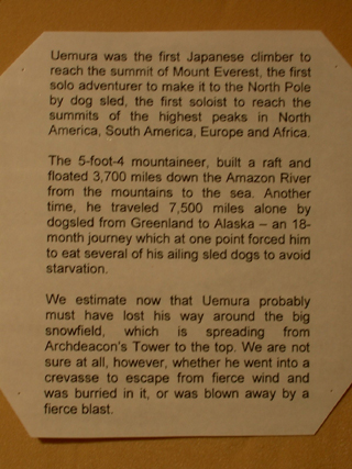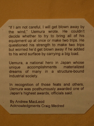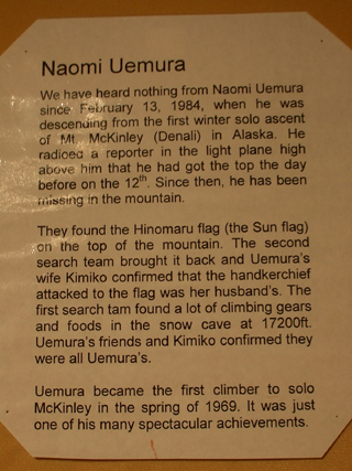 そしてこの博物館で個人に関わる内容としては最も詳しく植村直巳さんは紹介されていました。植村直巳ファンとして、このアメリカの小さな村でこういうものを目にして感慨深いものがありました。 |