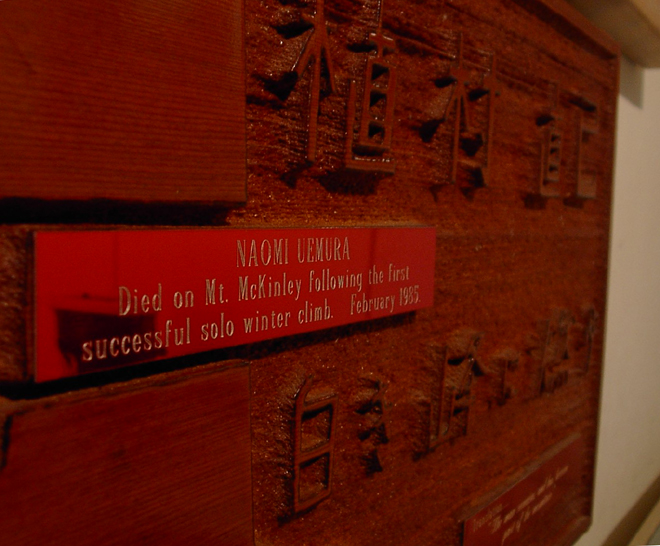 こんな感じです。植村直巳さんはここで準備をしてここからタルキートナのプロペラ飛行機でマッキンリーの登山を開始したのです。生前最期に泊まった場所です。真ん中の白い紙には植村直巳さんの偉人ぶりを英語で紹介してあります。そしてその両脇にプロペラ機で最期の笑顔を見せる植村さんの姿が残っています。とても素敵ないい笑顔なんです。そして、その上のほうには |