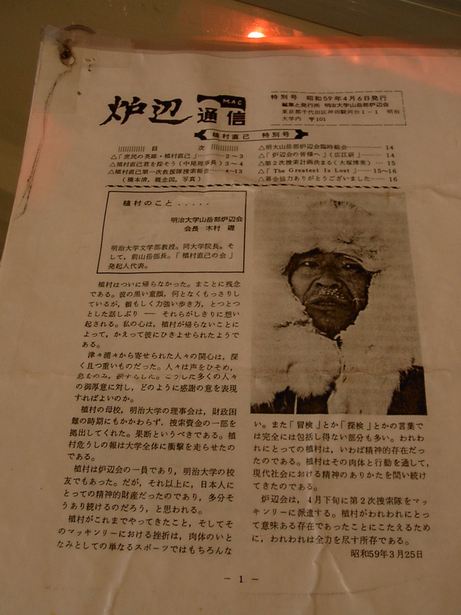 写真にあるように植村さんの写真がのってました。生前に撮ったものなのでしょう。植村さんは極寒の地に自らを順化させるためにエスキモーと一緒に生活をし訓練したことで知られています。植村師匠はエスキモーから得た知識として白熊の毛皮のフードとズボンを愛用していたそうです。写真に写った物はそれなのでしょう。彼はやはり本物です。