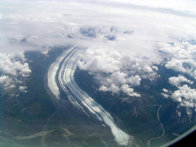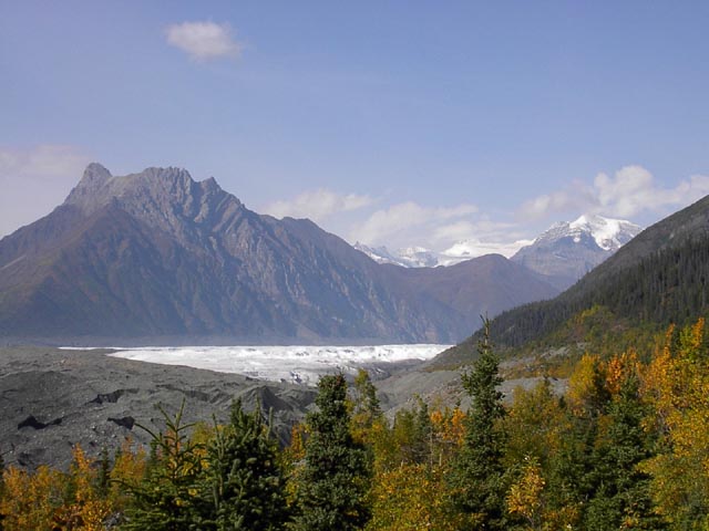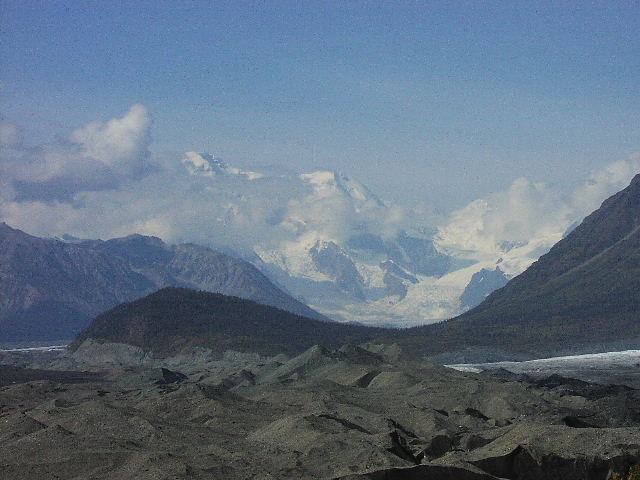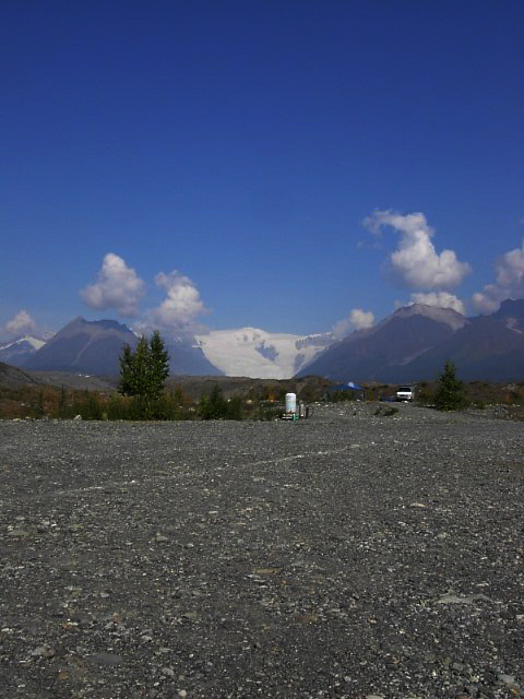 これ大量の砂、土をかぶったKennicott Glacier、氷河だったのです。氷河は白いものと思っていましたがこんな奴もあるんですね。幅は3キロくらい、長さは数10キロあります。かなり巨大です。そういえば確かに妙に寒い。 |