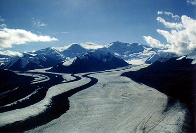 Elias National Park(ランゲル・セントエライアス国立公園)です。この公園、実に広大で日本の四国よりも大きいのです。国立公園としては世界最大で、世界遺産にも登録されてます。 |