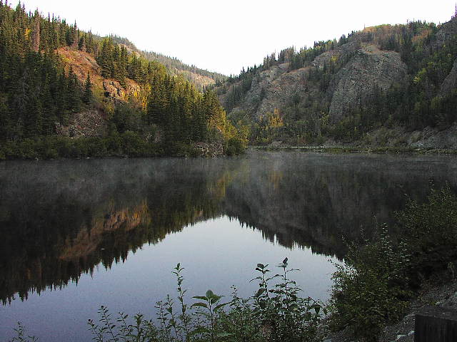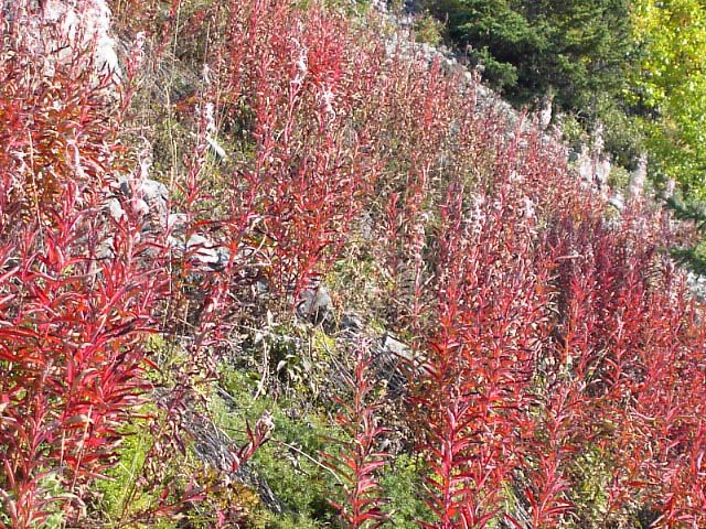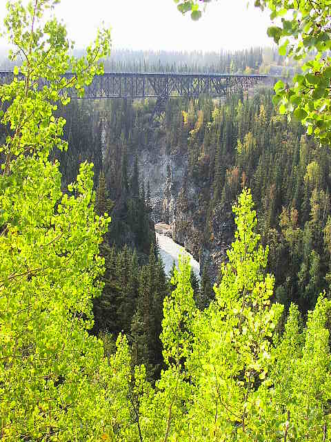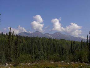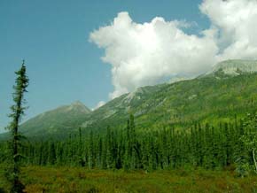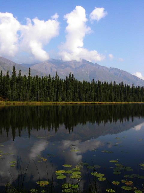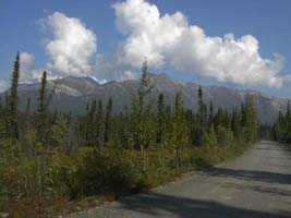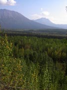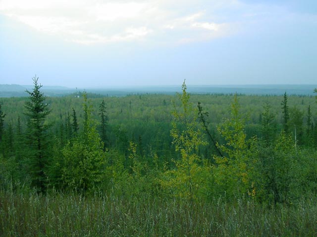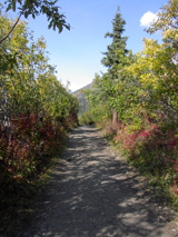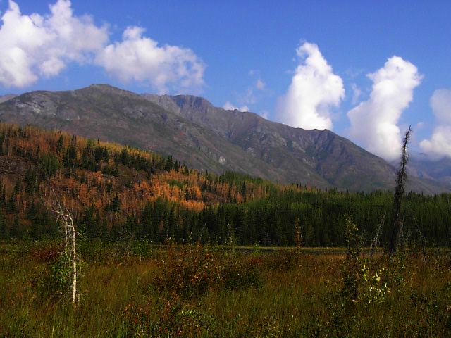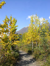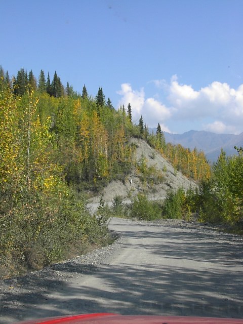 アラスカにはタイガ(針葉樹)の森、ツンドラ(苔)の大地が大変多いのですが、これはタイガの森です。写真辺りはアスペンツリーが多く黄色くなり始めた頃です。 |