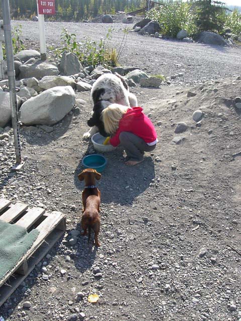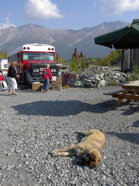 その観光案内所の前にはバスが一台あり、犬が3匹昼寝していました。なんとも気だるいアラスカの昼下がりでした。ここが目的の終点なのでしょう。 |