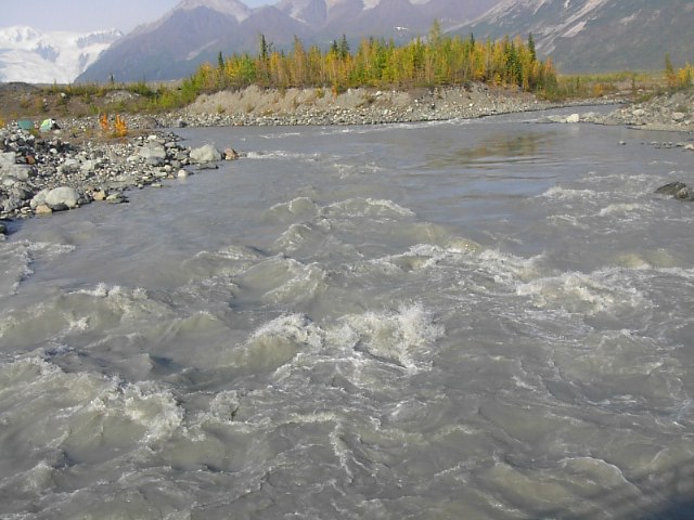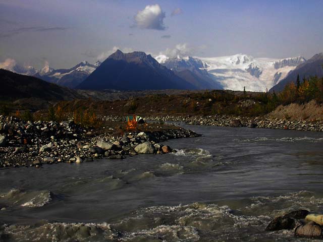 St. Elias公園には4000mを超える峰々、そしてそれに抱かれた無数の氷河があります。その氷河群こそこの場所が世界遺産に登録されたゆえんだと思います。ここの氷河は世界最大級の奴がいくつも、いくつもあるのです。その氷河は大地を休むことなく絶え間なく削ります。その証拠がこの川の色です。 |