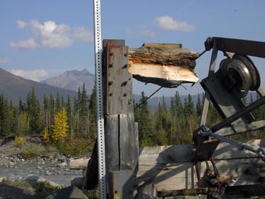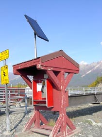と思っていたらこれは歴史的建築物でした。これは数十年前まで使われていたレッキとした橋でした。これに大きな袋状の物吊り下げてそれで移動するのです。川の水はこの左手の氷河に源と発し、冬は大量の雪がこの辺りを覆うため橋を作るのが極めて困難なのです。 |