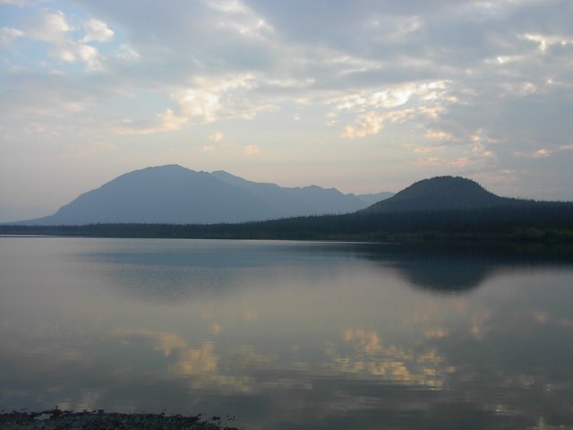 と、そうこう考えているうちにアンカレジ東にレンタカーで走り始めました。天気が比較的よさそうで、かつ風向きが煙の問題という点では都合よさそうだったので景色の見通しも少しはつくだろうと思ったからです。3時間走ると大きな湖が見えてきました。本来、煙の影響がなければこの向こうには延々と山が並んでいるはずの場所です。