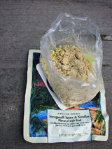 この日、前日の疲れ、それからアラスカ旅行最終日で時間が限られている、という問題もあって一番の手抜き料理にしました。ドライフードです。湯を沸かして、計量カップ2杯分くらいのお湯を入れて待つだけ。10分間。簡易の食事が完成するのです。