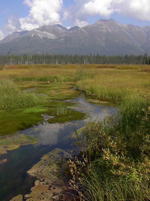 写真はとても変な景色ですが、これは氷河から流れ出す川の特徴です。アラスカにはこういう風な、浅い濁流で、くにゃくにゃ曲がった、しかも分岐の非常に多い川が沢山あります。パッと見の印象はとても異様です。この先にきっと氷河があるのでしょうし、またこの川の辺りはその昔、氷河の底だったはずなのです。 |