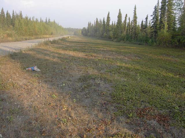 またある場所には、道路わきに意味不明な幅20M、長さ300Mくらいの平たい土地がありました。何かな?と思っていたところ、これはプロペラ飛行機の離着陸用の滑走路、いわゆる空港でした。これ、今も使われているそうです。この辺って余りにも辺鄙すぎて、ここの人たちって、車じゃ、ラチがあかない為にプロペラ機を当たり前のように使う訳です。ちょっと、広い場所、たとえばツンドラの大地とか、広い湖があればそこはもう彼らの恰好の滑走路になってしまうわけです。彼らの車は飛行機なのです。 |