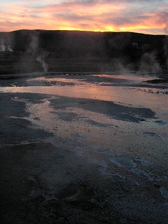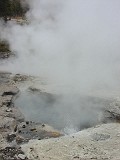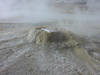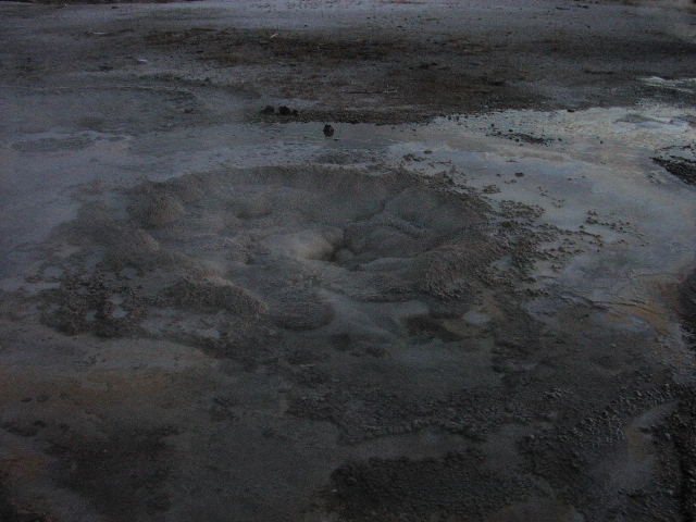 アッチ、コッチにボコボコ、ゴゴゴゴ...と音立ててる場所があって、同じように噴き出すのではないかと待っていると、そう簡単には出てこない... 30分ほど間欠泉の噴出を待ち構えているうちに日が暮れてしまいました。結局この日は、たまたまさっき見て写真にできた一個だけ。 |