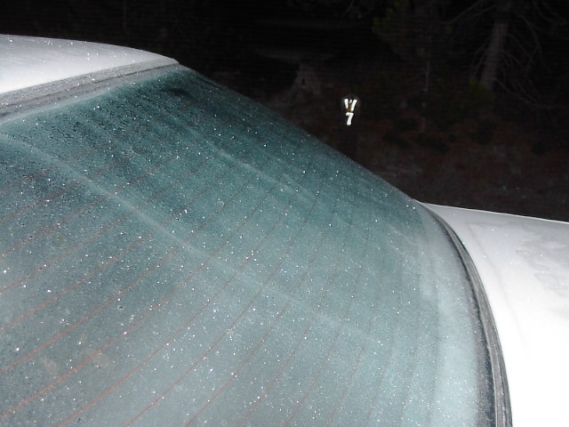 と思いながらも、朝、寝袋の中でゴソゴソと着替えるのは、なんだか楽しい持間でした。朝、顔を洗いましたがガスストーブでお湯にしないと、とてもやってられませんでした。テントを出ると、自動車やテントに降りた朝露はバリバリに凍っていました。 |