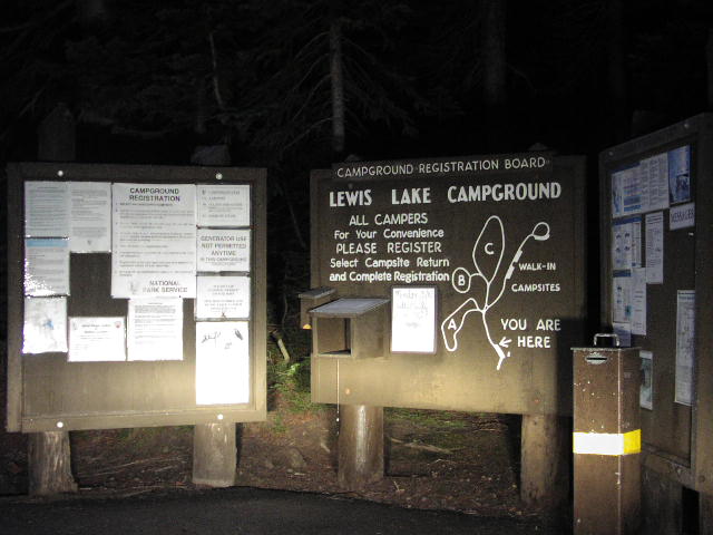 やっとこさ暗い中、車を見つけてキャンプ場についた時には完全に夜でした。ここまで暗くなるとは思わなかった... 何にも見えない、完璧な暗黒の世界です。Yellow
