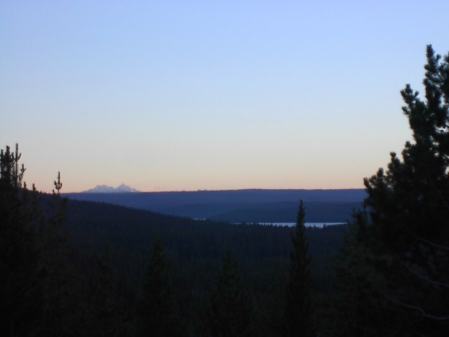 途中、見晴らしの少し効く場所があってロッキー山脈の麓を少し見下ろす形となりました。が、あまりに広大で高さを感じないくらいでした。そして、(写真左手に写っている様に)はるか彼方にGrand Tetonの山並みが見えていました。 |