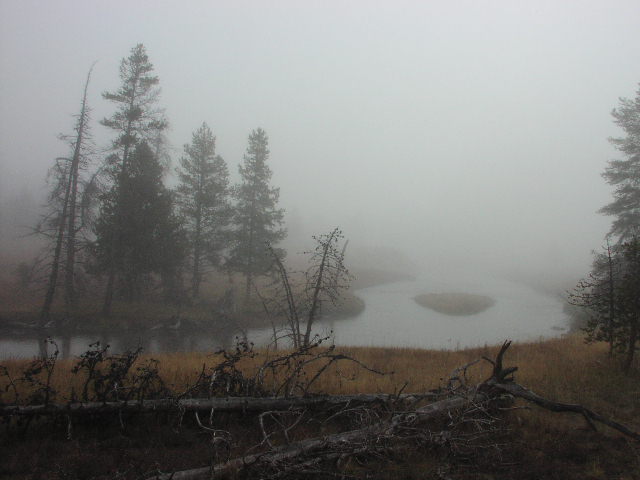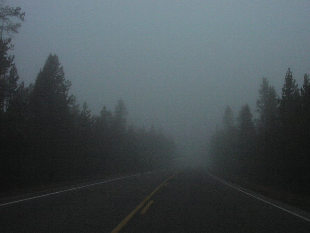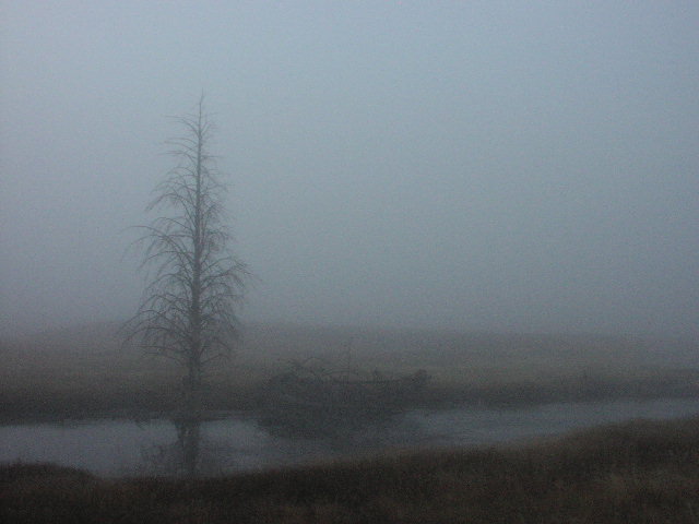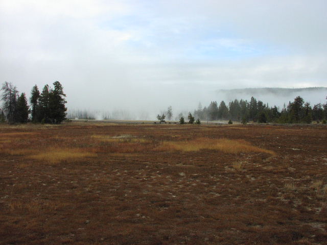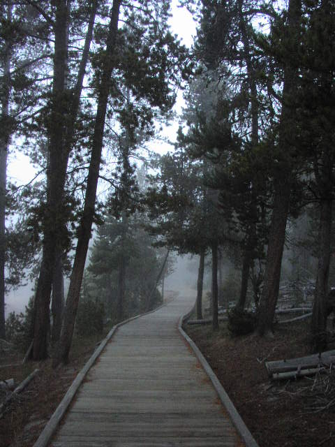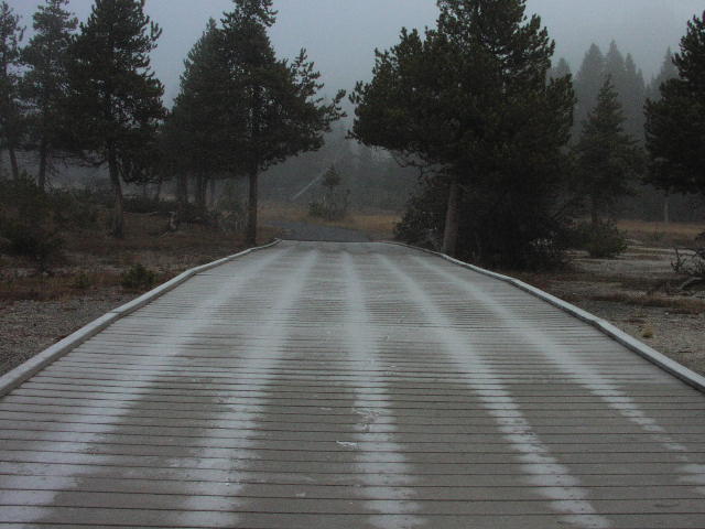 Faithful間欠泉があって沢山の観光客がズラリとそれを見守る筈の場所なのですが今は朝早すぎます。まだ誰もいませんし、朝靄が間欠泉の存在すら見えなくしています。とても深い朝靄で50mくらい先すら見通しが効きません。(ちなみに、上で既に紹介した夜闇でみた間欠泉がOld
