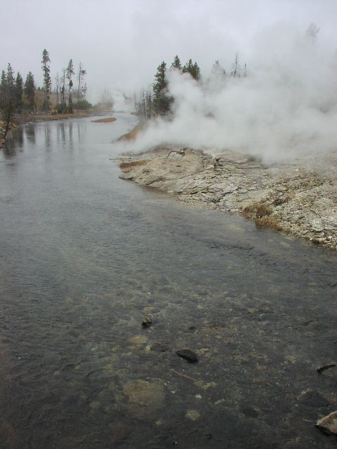 間欠泉から流れ出て、寒い外気で冷やされた温泉の水は |