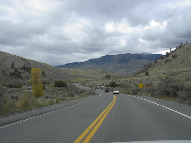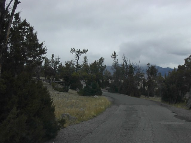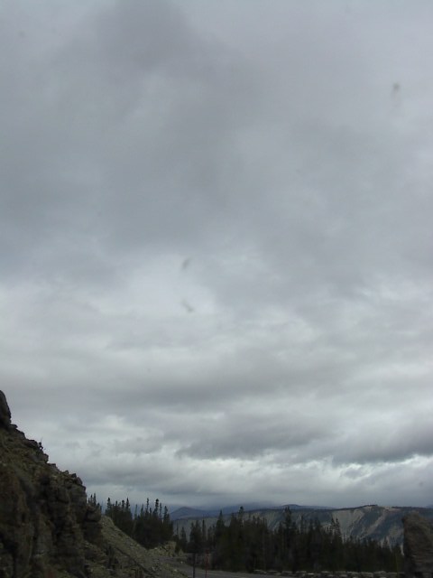 天気が悪くて全く冴えません。そして、かなり寒いところです。この一帯は、まさにロッキー山脈のど真ん中。ドライブ途中、何回も大陸分水嶺を越えました。丁度、ロッキー山脈大陸分水嶺を南北に走るような感じの道です。高度は2500mくらいのところを数時間ドライブしました。 |