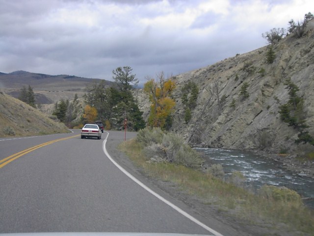 季節は秋で、高度の低いところでは紅葉が、川にそって続いていました。白波立てる川はYellow Stoneを思うときに思い出される景色、印象のひとつです。 |