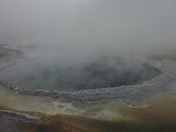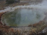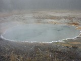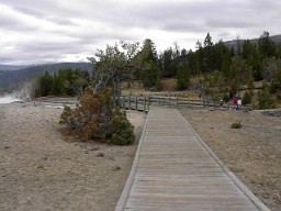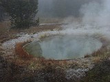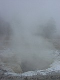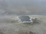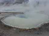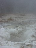 メインが朝靄で見えないなら仕方ない、とトレイル少々歩いて他の奴見て時間つぶすことにしました。トレイルは木で作られた大変歩きやすいシッカリとしたものでしたが、その上に降りた朝露が凍って滑って危なかった... この場所、温泉の湯気で空気が湿気を沢山含んでいるのでこんなになってしまうんでしょうか。そのため朝方に限って言えば滑ってとても歩きにくい状態でした。 |