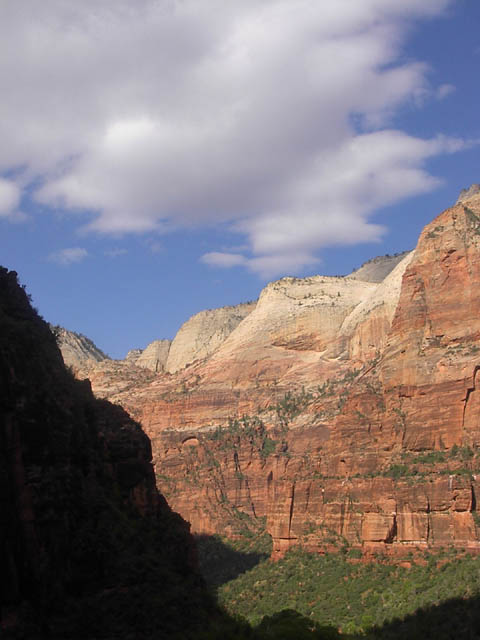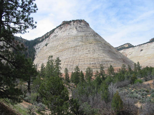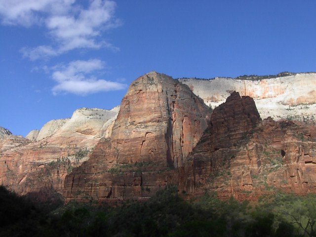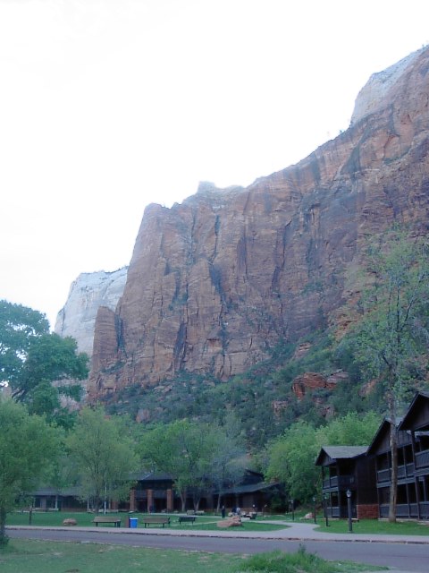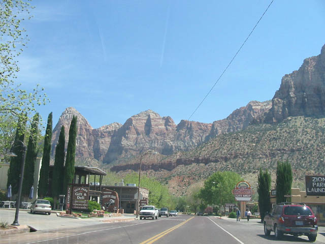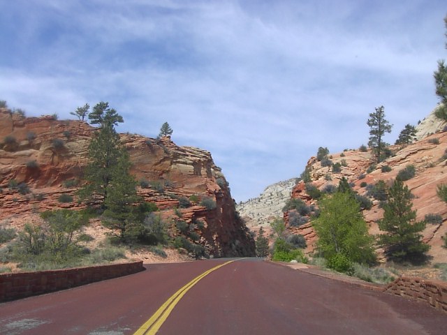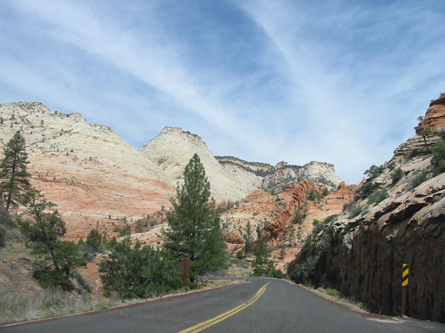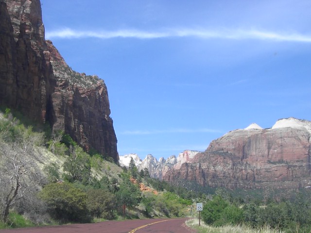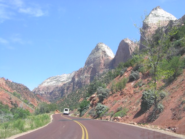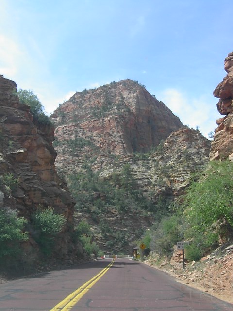 Zion国立公園はラスベガスから比較的近い場所にあることもあってとても人気のある国立公園です。ラスベガスからは約2時間半程でここに到着できる手軽さもありますが、やはりこの公園の素晴らしさそれは折り紙つきです。東の方からアプローチしたのですがはじめはこの程度の岩が目の前に現れてきました。道路自体が岩肌と同じ色に塗られこの公園なりの雰囲気を出しています。 |