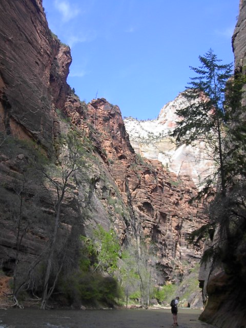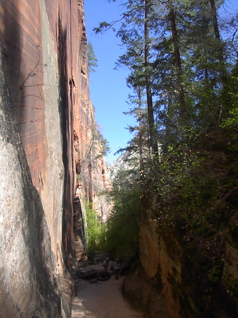 そしてナローズに到着です。ナローズは両方に巨大な岩壁が続きそこに川が流れています。そこをジャブジャブと歩いて上流に向かって歩いていくことが出来ます。実際にこの写真でも歩いている人がいますね。